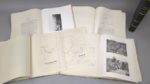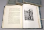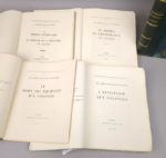 Réunion de 5 ouvrages historiques de la collection LES ARMEES FRANÇAISES D'OUTRE-MER. Collection éditée à l'occasion de l'Exposition coloniale internationale de Paris de 1931 et tirée à 1000 exemplaires, d'un format de 22 par 28 cm: 1. Le Service vétérinaire et le service de la remonte aux colonies. Paris, Imprimerie Nationale, 1931. Un volume. (4)-XIII-(1)-106-(3) pages + 18 planches h.t. Broché, couverture imprimée. Dos insolé. Edition originale. La première partie retrace le rôle (non borné à leur art) des vétérinaires militaires, pour chaque groupe de colonies (surveillance de l'alimentation des colons et des indigènes, travaux de recherche en laboratoire, etc.) ; la seconde traite des buts poursuivis par le service de la remonte : "améliorer les conditions de l'élevage en améliorant l'hygiène et la nourriture des animaux ; améliorer les races autochtones par des croisements judicieux et par la création d'établissements hippiques ; encourager l'élevage par divers moyens, achats, concours de primes, courses, etc.." 2. [ASTOUIN (Colonel Louis) et PÉRIER (Capitaine Roger)]: Le train des équipages aux colonies. Paris, Villain et Bar, 1931. Un volume. (2)-XVII-(1)-158-(1) pages + 7 cartes h.t. (dont 6 dépl.) + 1 portrait h.t. + 11 planches h.t. Broché, couverture imprimée. Dos insolé. Edition originale. Ouvrage divisé en quatre parties, consacrées à l'Afrique du Nord, à l'Afrique occidentale, -surtout Madagascar-, à l'organisation des convois en Chine, en Cochinchine et au Tonkin, et enfin au Levant (Cilicie, Liban, Djebel Druze). 3. [PAUL (Lieutenant-colonel Georges-Eugène) et BASSET (Capitaine)]: L'artillerie aux colonies. Paris, Villain et Bar, 1931. Un volume. XVI-403-(2) pp. + 20 planches h.t. + 9 cartes h.t. (dont 5 dépl.) Broché, couverture imprimée. Dos insolé. Edition originale. Écrit en collaboration avec le lieutenant-colonel Charbonneau, cet ouvrage relate "l'historique de l'emploi de l'artillerie métropolitaine outre-mer, […] le rôle de l'artillerie de marine ou coloniale comme arme combattante [… et] comme service [d'] équipement militaire [et économique] des colonies." 4. [GAUCHER (Intendant Général) et RIVIÈRE (Intendant)]: Le service de l'intendance aux colonies. Paris, Villain et Bar, 1931. Un volume. (8)-290-(1) pages. Broché, couverture imprimée. Dos insolé. Edition originale. "Une Première partie est consacrée aux "Intendants et commissaires aux colonies dans le passé", c'est-à-dire jusqu'à la seconde moitié du XIXe siècle. La Deuxième partie étudie le rôle du Commissariat et de l'Intendance, tant métropolitaine que coloniale, dans l'expansion coloniale moderne. Broché, couverture imprimée. Dos insolé. 5. Les Grands soldats coloniaux. Paris, Henri Jonquières, 1931, Un volume. (4)-442-(1) pages + 33 portraits h.t. + 3 cartes dépl. h.t. + 1 f. d'avant-propos paginé [15]-16 entre les pp. 4 et 5. Demi-basane bleu marine de l'époque, à coins, dos 4 nerfs, plats sup. de la couverture conservés. Petites épidermures, sinon très bon état de l'exemplaire. Broché, couverture imprimée. Dos insolé. 39 biographies de pionniers, d'explorateurs et de militaires, tels que Samuel Champlain, Montcalm, Dupleix, le maréchal Clauzel, le maréchal Bugeaud, le Duc d'Aumale, Marchand, le maréchal Lyautey, etc..