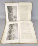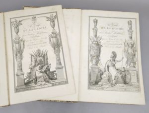 JUBÉ DE LA PÉRELLE (Auguste, Baron): Le temple de la gloire ou les fastes militaires de la France depuis le règne de Louis XIV jusqu'à nos jours. S.l.n.d. [Paris, Rapet, 1819-1820]. 2 volumes. 28 par 42,5 cm. 1 titre frontispice compris dans la pagination-XXVIIII-335 pages + 19 planches gravées h.t.; 1 titre frontispice-(2)-379 pages + 19 planches gravées h.t. Demi-toile de l'époque (usée et légèrement tachée), pièce de titre en basane sur les dos, plats frottés, coins émoussés. Rousseurs éparses dans le texte, rarement sur les gravures. Tome 1 : Siècle de Louis XIV, XV, XVI ; Tome 2 : Révolution française [1792 - 1802]. Belle publication illustrée de 2 frontispices et de 38 gravures d'après les dessins de Martinet (complet). Brunet III-col. 591. Détail des 38 gravures : I -Bataille de Rocroy ; -Bat. de Retel ; -Bat. des Dunes ; -Passage du Rhin ; -Bat. de Séneff ; -Bat. d'Ensheim ; -Siège et prise de Valenciennes ; -Soumission du Doge de Gênes ; -Bat. de Fleurus ; -Bataille navale de la Manche ; -Bat. de Nerwinde ; -Bat. de Fridlinchen ; -Bat. de Cassano ; -Bat. de Villa-Viciosa ; -Bat. de Denain ; -Bat. de Fontenoy ; -Prise de la Grenade ; -Prise de Saint-Christophe ; -Capitulation de Cornwallis. II -Défense de Thionville ; -Bataille de Valmy ; -Bat. de Jemmapes ; -Bat. de Hondscoote ; -Bat. de Fleurus ; -Bat. de Saint-Laurent de la Mouga ; -Conquête de la Hollande ; -Passage du Rhin à Khel ; -Mort du Général Marceau ; -Serment du Colonel Rampon ; -Bat. de Castiglione ; -Bat. d'Arcole ; -Départ de l'Armée d'Orient pour l'Égypte ; -Bat. des Pyramides ; -Bat. du Montabord ; -Bat. d'Aboukir ; -Bat. de Marengo ; -Passage du Mont-Saint-Bernard ; -Bat. de Hohenlinden. Complet des 3 gravures relatives à la guerre d'indépendance de l'Amérique : Prise de la Grenade, Prise de St Christophe, et la plus rare, celle représentant Washington, Rochambeau et Lafayette lors de la capitulation de Cornwallis.