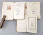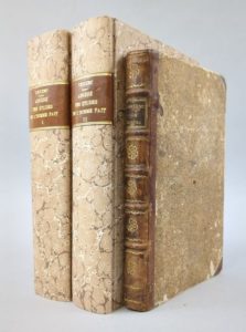 Réunion de 2 ouvrages d'inspiration physiocratique: 1. [POLIER DE SAINT-GERMAIN (Antoine)]: Du gouvernement des moeurs. Lausanne, Jules Henri Pott & Comp., 1784. Un volume. 12 par 20,5 cm. VI-337-(1) pages. Demi-basane de l'époque, à coins, dos 5 nerfs orné. Papier des plats usés, sinon bon état de la reliure et du texte. Edition originale, peu fréquente. Conlon 84 : 1656 ; I.N.E.D. 3617. "Favorable à la physiocratie […], Antoine Polier de Saint-Germain propose tout particulièrement de donner des terres aux pères de famille qui contribuent à l'accroissement de la population et aux laboureurs dont la société tire sa subsistance. […] Il entend substituer à un ordre social fondé sur les privilèges de la naissance un autre dont la base serait les bonnes moeurs." 2. LE CLERC (Nicolas-Gabriel): Abrégé des études de l'homme fait, en faveur de l'homme à former, dédié aux représentans de la nation. Paris, Maradan, 1789. 2 volumes. 14 par 22 cm. XCVI-427; (4)-XXXIV-1 f. blanc-398 pages. Cartonnage bradel moderne, ex. non rogné. -Petit travail de vers sans atteinte du texte dans la marge int. de 3 cahiers du second volume (sans gravité), mouillures claires sur qq. cahiers du second volume, ex-libris collés au verso des titres. Edition originale. Quérard I-p. 316 ; Conlon 89 : 9457 ; I.N.E.D. 2723. Vaste projet de réformes progressistes sur l'éducation, la liberté du commerce, le droit naturel. "Nicolas-Gabriel Clerc, dit Leclerc (1726-1798), savant français envoyé par Louis XV en mission à l'étranger, s'installe à Pétersbourg et y dirige les établissements de Catherine II avant de se charger de la traduction française des projets éducatifs de la tsarine. De retour en France, Leclerc propose de ressusciter les idées novatrices du pédagogue allemand Johann Bernhard Basedow (1724-1790) et présente un plan d'éducation nationale [d'inspiration rousseauiste] à l'Assemblée constituante française." Les réformes économiques proposées sont d'inspiration physiocratique : elles s'inspirent de Dupont de Nemours.