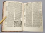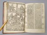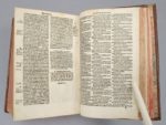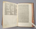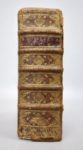 [reliure armoriée] [BIBLE] Biblia Cum Summarum Apparatu Pleno... Paris, Jean Prevel, Juin 1528. Un volume. 10 par 15 cm. 480-(51) feuillets. Plein veau glacé postérieur (18ème), dos 5 nerfs, caissons ornés, pièce de titre rouge, roulette sur coupes. Armes de Nicolai Joseph FOUCAULT au centre des plats. Un mors fendu (sans atteinte à la solidité de l'ouvrage), manque de cuir sur le bas du dos, quelques taches sur le second plat, coins légèrement usés. Les 10 derniers feuillets ont été restaurés en marge anciennement, avec perte de caractères, de même pour les feuillets XXVI et XXVII (perte des commentaires en marge). Un petit trou dans le feuillet primo, avec là encore perte de quelques caractères. Il manque à notre exemplaire les 28 feuillets d'introduction. Il contient bien l'explication des termes hébraïques, et la table. Très belle impression sur deux ou trois colonnes en caractères gothiques. Une gravure sur bois hors texte décrit les 6 jours de la création. 3 vignettes dans le texte (Lettre de St Jérôme, la genèse et les proverbes), lettrines. Jacques PREVEL, imprimeur à Paris, donna trois éditions de la Bible (1519, 1523 et 1528). L'édition de 1528 est très proche de celle de 1523, si ce n'est des lettrines différentes. Nicolas-Joseph Foucault (1643-1721) est un haut fonctionnaire et bibliophile français. Erudit, il découvrit à l'abbaye de Moissac le manuscrit du De mortibus persecutorum, attribué à Lactance, et qui n'était connu que par une citation de saint Jérôme. Un ouvrage rare, présenté ici avec ses défauts…