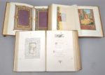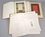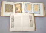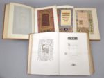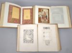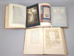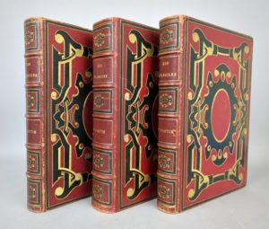 Les ÉVANGILES des dimanches et fêtes de l'année. Paris, L. Curmer, 1864. 3 volumes. 19 par 28 cm. XLIII-174; 171-364; (6)-XXXII-258 pages. Plein maroquin rouge, orné d'un important décor d'enroulements mosaïqué en maroquin noir et azuré sur les plats, dos orné de même, dentelle intérieure, filets sur coupes, doublure et gardes de soie verte, tranches dorées. Reliure signée Alexandre SEGOUIN. Quelques frottements sur les nerfs, les coins et les mors, sans gravité. Les deux premiers volumes sont entièrement montés sur onglets, et composé de pages en chromolithographie, d'une immense richesse picturale. Il y a des reproductions d'enluminures médiévales, mais aussi des encadrements et décors originaux extrêmement variés. Quelques pages au dos légèrement assombri, quelques serpentes froissées, là encore sans gravité. Le troisième tome, lui aussi sur onglets, est un Appendice aux Evangiles. La première partie comprend les sept dons du Saint-Esprit, illustrés de photographies contrecollées des oeuvres des frères WIETRIX. Suit un texte explicatif érudit sur ces illustrations. Ce 3ème tome, sans chromolithographie, a quelques rousseurs. Léon CURMER avait fait de sa maison d'édition la plus fameuse en chromolithographies médiévales, comme sa célèbre Imitation de Jésus-Christ le montre magnifiquement. Ces évangiles sont à la hauteur de ce monument de l'édition. Ici un très bel exemplaire dans une reliure mosaïquée dans le style Renaissance, en parfaite adéquation avec l'ouvrage. Pour collectionneur.
