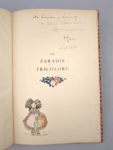 HANSI (WALTZ Jean-Jacques, dit): Le Paradis Tricolore, par l'Oncle Hansi. Paris, Floury, 1918. Un volume. 20 par 30 cm. 40 pages. Plats en toile illustrée d'éditeur, étiquette de titre illustrée sur le plat supérieur. Plats très légèrement poussiéreux, excellent état intérieur. 8 hors-textes en couleurs. Exceptionnel envoi manuscrit de HANSI au capitaine Lorentz, daté de Noël 1918, envoi enrichi d'un dessin original en couleurs représentant une petite alsacienne en costume. Envoi fait juste après l'armistice du 11 Novembre, consacrant le retour de l'Alsace à la France, pour lequel HANSI avait constamment milité. Le capitaine Lorentz commanda la 11ème compagnie du 124ème régiment d'Infanterie.