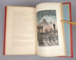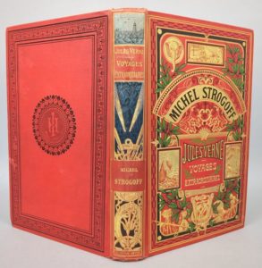 VERNE (Jules): Michel STROGOFF - Moscou - Irkoutsk- suivi de Un drame au Mexique. Paris, Hetzel, s.d. (1905-1914). Un volume. Cartonnage polychrome dit à un éléphant et à l'éventail, titre dans l'éventail, dos au phare. Plats en très bel état, papiers de garde intacts, gorge parfaite, absence de rousseurs. Jauzac p. 212. Un très bel exemplaire de ce titre célèbre.