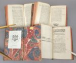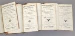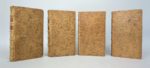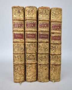 (GROSLEY J.-P.): Observations sur l'Italie et sur les Italiens, données en 1764, sous le nom de deux Gentilshommes Suédois. Par M. G. Londres et Paris, De Hansy, 1774. 4 volumes. 9,5 par 16,5 cm. XXII-(2)-406; (4)-432-(2); (4)-430-(2); (4)-453-(1) pages. Pleine basane d'époque, dos 5 nerfs, caissons ornés, pièces de titre et de tomaison rouges. Légers frottements sur les coiffes, coins légèrement usés, sinon bon état de la reliure. Quelques rares rousseurs claires, sinon très bon état intérieur. Quelques notes manuscrites rectifiant le style en marge (de l'auteur?). Pierre-Jean Grosley (1718-1785) est un historien et homme de lettres français. En 1745 et 1746, il fit la campagne d'Italie dans l'état-major du maréchal de Maillebois, en qualité de caissier des vivres et, à son retour, il en écrivit l'histoire intitulé Observations sur l'Italie et les Italiens. Esprit original, il avait formé à Troyes, avec quelques-uns de ses amis, une Académie pour rire, dont les Mémoires, composés à frais communs, n'étaient que des pièces badines et burlesques, où l'érudition apparente le disputait au comique du sujet. Cela ne l'empécha pas de contribuer aux tomes IV et XIV de l'encyclopédie de Diderot et d'Alembert…