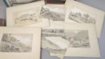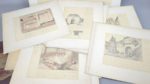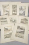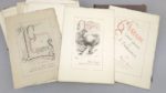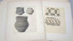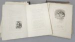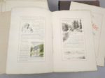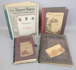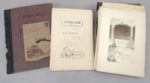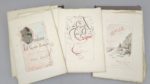 Quatre manuscrits de Hector GUIOT sur CHAUMONT et LANGRES La Haute-Marne & le Vieux Chaumont. Croquis & Notices par Hector Guiot, Officier de l'instruction publique. Un volume. 19 par 28,5 cm. Un ensemble de 18 cahiers en feuilles, de 6 à 8 feuillets chacun, réunies dans une chemise cartonnée avec la couverture illustrée sur le 1er plat, dos en toile noire. Le dos est déchiré, le reste de l'ouvrage en très bon état (un seul cahier, sur un papier différent, présente des rousseurs). Les cahiers sont parfois datés, de 1875 à 1897. Tous sont illustrés, parfois à l'aquarelle ou au lavis, et les textes sont manuscrits. Quelques titres: L'antiquaire, souvenir du pays Langrois. Les Femmes de Brennes en Brennois, facétie du pays Langrois L'Arquebuse & les arquebusiers, 1590.Les Cocus de la St Gengoul, légende Langroise La Tour de l'Eglise St Jean-Baptiste de Chaumont, etc. On peut penser que ces petits textes illustrés étaient destinés à devenir un jour un ouvrage complet. Avec La Haute-Marne historique & pittoresque. Chroniques & Imaiges. Chasteaux féodaux, portes anciennes, moustiers & prieurés, Eglises & chapelles, pourtraicts. Par Hector Guiot, artiste-peintre, officier de l'Instruction publique, 1892. Un volume. 34 par 40 cm. 35 planches sur carton, en feuilles dans une chemise en demi-percaline verte d'époque. Couvertures illustrées en couleurs (très beau second plat). Quelques traces d'humidité sur la chemise, pli sur le second plat, rousseurs sur les bords des cartons (sans gravité). Les dessins, au crayon à papier, à l'aquarelle, sont encadrés d'un texte explicatif. Ils sont soit directement sur le cartons, soit contrecollés. Fouilles de Nogent de Roy, le Mont Saon,;Monuments de Langres, monuments de Chaumont, Braulx, Dinteville, etc. Avec La Haute-Marne; Chaumont et ses environs. Croquis d'après nature. Hector Guiot, officier de l'instruction publique. Un volume. 26,5 par 35 cm. 17 cartons forts avec des dessins au crayon contrecollés, plus trois dessins isolés. Sous une chemise en demi-toile brune d'époque, 1er plat illustré avec une sanguine contrecollée. Toile coupée. Rousseurs éparses. Avec Autour de Chaumont. Croquis d'après nature par Hector Guiot, officier de l'instruction publique. 1896. Un volume. 26,5 par 35 cm. 9 cartons forts avec des dessins contrecollés, dans une chemise en demi-percaline rouge d'époque, une illustration contrecollée sur le 1er plat. Très bon état de la reliure, rousseurs éparses. Ce recueil se caractérise par des dessins se subdivisant pour la plupart en deux ou trois parties. Les endroits sont précisés, et sont datés de 1896. 4 manuscrits d'une grande qualité. Il ne semble pas qu'ils aient été édités. Hector GUIOT, né à Langres, fut professeur de Dessin au Lycée de Chaumont, puis Conservateur du musée de la ville, où il mourrut. On comprend son intérêt pour cette région.