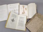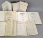 Réunion de 8 ouvrages 18ème et 19ème sur l'ostéologie: 1. VIGAROUS (Barthélemi): Opuscules sur la régénération des os, les loupes osseuses et les hernies. Publiés et augmentés par M. Vigarous de Montagut. Paris, Mequignon, 1788, un volume 12 par 20 cm. VIII-223-(2) pages. Cartonnage bradel moderne. Très lég. mouillures marginales. Première édition collective. Blake p. 474 ; manque à Osler et à Waller. Vigarous est considéré comme un précurseur de l'ostéoplastie. 2. COOCHE (Edouard-Joseph): Quelques considérations sur les fractures de la jambe. Thèse présentée et publiquement soutenue à la Faculté de Médecine de Montpellier, le 15 juin 1844. Montpellier, Pierre Grollier, 1844. Un volume. 19 par 25 cm. 34-(2) pages. Cartonnage bradel moderne. Petite mouillure dans la marge sup. de l'ensemble des ff., rares rousseurs. Edition originale. 3. WAGHETTE (Nicolas-Jules-Ed.): Réflexions sur les divers points où l'on peut amputer la jambe. Thèse présentée et publiquement soutenue à la Faculté de Médecine de Montpellier, le 21 juin 1847. Montpellier, Ricard Frères, 1847. Un volume. 19 par 25 cm. 44 pages. Cartonnage bradel moderne. Mouillure lég. dans la marge sup. de l'ensemble des ff., qq. rousseurs claires, envoi autographe signé de l'auteur sur le 2e ff.. Edition originale. Pas d'exemplaire au N.U.C.. 4. MALAVAL (Dr Marcellin): Quelques considérations sur les principales méthodes de traitement des fractures, appliquées au traitement des fractures simples de la diaphyse du fémur. Thèse présentée et publiquement soutenue à la Faculté de médecine de Montpellier, le 25 avril 1854. Montpellier, L. Cristin et C., 1854. Un volume. 19,5 par 25,5 cm. 29-(3) pages. Cartonnage bradel moderne. Rousseurs sur les 2 premiers ff. Edition originale. 5. LANNELONGUE (Dr Odilon-Marc): Abcès froids et tuberculose osseuse. Avec figures dans le texte et 12 planches en chromolithographie. Paris, Asselin et Cie, 1881. Un volume. 14,5 par 23 cm. (4)-186 pages et 12 planches h.t. dont 6 en couleurs. Demi-chagrin rouge de l'époque, dos 5 nerfs joliment orné. Exemplaire en très bon état. 9 figures in-texte. Edition originale. 6. OLLIER (Léopold): Ostéoplastie appliquée à la restauration du nez. (Lu à la Société impériale de médecine de Lyon). Lyon, Aimé Vingtrinier, 1863. Un volume. 13 par 21 cm. 12 pages. Cartonnage bradel moderne. Ollier s'intéressa à la chirurgie réparatrice et pratiqua de nombreuses rhinoplasties. 7. OLLIER (Léopold): Des tendances actuelles de la chirurgie. Discours prononcé par l'auteur lors de son installation comme chirurgien major de l'Hôtel-Dieu de Lyon [le 23 janvier 1863]. Lyon, Aimé Vingtrinier, 1863. Un volume. 12,5 par 21 cm. 38 pages. Cartonnage bradel moderne. Edition originale. 8. OLLIER (Léopold): De l'inégalité congénitale des deux moitiés latérales du corps chez l'homme. Insuccès de quelques tentatives expérimentales pour reproduire de pareilles lésions chez les animaux. S.l.n.d. [1869]. Un volume. 12,5 par 21 cm. 6 ff. ch. [105] à 116. Cartonnage bradel moderne. Très rare extrait du Journal de physiologie. Le Worldcat n'en localise qu'un seul exemplaire (Yale university) ; le CCFr. n'en recense aucun.