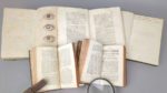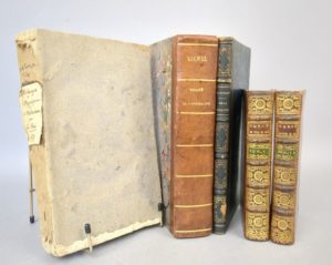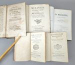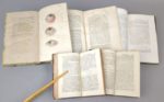 Réunion de 4 ouvrages en 5 volumes d'ophtalmologie: 1. CASTORANI (Raphaël): De la kératite et de ses suites. Paris, Germer Baillière, 1856. Un volume. 12,5 par 20,5 cm. VIII-147 pages. Demi-chagrin noir de l'époque, dos à nerfs orné, tranches dorées. Un petit manque de cuir sur le bas du dos, et des rousseurs éparses. Envoi autographe signé de l'auteur au prof. J. Cloquet sur la page de garde. Edition originale. 2. LE ROY (Charles): Mélanges de physique et de médecine. Paris, P.G. Cavelier, 1771. Un volume. 13,5 par 21,3 cm. (2)-IX-(1)-400 pages + 1 planche dépliante h.t. Broché, sous couverture d'attente de l'époque, non rogné. Petits manques de papier sur le dos, rousseurs éparses, petites mouillures marginales sur une vingtaine de ff. Bon exemplaire non rogné dans sa condition d'origine. Edition originale. Conlon 71 : 1121 ; Partington III-p. 763. Table : -Mémoire sur l'élévation & la suspension de l'eau dans l'air ; & sur la rosée. -Mémoire sur l'usage des eaux de Balaruc. -Observations sur les eaux de Balaruc. - Mémoire sur le méchanisme par lequel l'oeil s'accomode aux différentes distances des objets. -Second mémoire sur la vision, considérée relativement aux différentes distances des objets. -Mémoires sur les fièvres aiguës. -Réflexions & observations sur le scorbut. -Mémoire sur les eaux sulfureuses, contenant le moyen de les imiter parfaitement. -Précis sur les eaux minérales. 3. LAZERME (Jacques): Curationes morborum. Monspelii, Isaaci-Petri Rigaud, 1750, 2 volumes. 8,5 par 15,5 cm. (8)-357-(3 bl.); (Praefatio auctoris) et (6)-307 pages Plein veau de l'époque, dos 5 nerfs joliment ornés, pièce de titre rouges, de tomaison noire, roulette sur coupes. Très bon état de la reliure, papier parfois légèrement bruni. Edition originale. Conlon 50 : 711 ; Blake p. 259. "Jacques Lazerme doit occuper [… dans l'histoire de l'oculistique à Montpellier] une place plus importante bien que ce qu'il ait écrit sur les maladies des yeux soit inclus dans un traité de thérapeutique plus général. On trouve en effet dans le premier tome de ce livre, la thérapeutique oculaire contenant des définitions courtes et bonnes de ces maladies. La précision et la netteté y règnent. Les médicaments y sont prescrits simplement. Les eaux minérales sont recommandées. Enfin, et surtout peut-être, il a de réelles notions de chirurgie oculaire. Ce chapitre très équilibré contraste avec celui sur les affections des oreilles et de la bouche qui sont, elles, traitées très superficiellement." (Dulieu: La médecine à Montpellier III-pp. 382-383). 4. SICHEL (Dr Jules): Traité de l'ophthalmie, la cataracte et l'amaurose, pour servir de supplément au traité des maladies des yeux de Weller. Paris, Germer Baillière ; Montpellier, Castel et Sevalle ; Lyon, Savy ; Londres, J.B. Baillière ; Strasbourg, Dérivaux et Levrault, 1837. Un volume. 13 par 20,5 cm. XI-(1)-750 pages + 1 f. d'errata + 4 planches h.t. en couleurs (complet). Demi-basane havane d'époque. Majorité des ff. roussie. Edition originale.