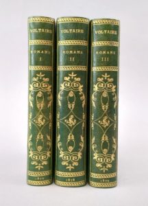 VOLTAIRE: OEuvres - Romans, avec Notice, notes & variantes par Frédéric Dillaye. Paris, Alphonse Lemerre, 1877-1879. Trois volumes. 8,5 par 15,5 cm. Demi-chagrin vert impérial à coins d'époque, dos lisse richement décoré de motifs romantiques, tête dorée, couvertures conservées, non rogné. Excellent état de l'exemplaire. Les romans de VOLTAIRE sont parmi ses textes les plus connus et appréciés (Zadig, Micromégas, Candide, l'homme aux 40 écus, etc.). Ici dans un très charmant exemplaire.