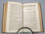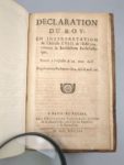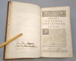 [Du Tillet (Jean)]: Recueil des édits, déclarations et arrests, rendus en faveur des curez, vicaires perpétuels, vicaires amovibles, chanoines & autres bénéficiers concernant les dismes grosses, vertes, menuës (…) ; les portions congrues des curez (…) les défenses aux Officiers de rendre la justice sous les porches des églises, dans les cimetières & dans les cabarets, (…). Paris, Guillaume Saugrain, 1699. Un volume. 11 par 18,3 cm. (4)-156-(4)-16-82-(12); 23; 4 pages. Plein veau d'époque, dos 5 nerfs, caissons ornés. Quelques frottements sur les plats. Rousseurs éparses dans l'ouvrage. La première partie est un Abrégé sur les dîmes. Puis suivent différents arrests du Conseil. Edition originale. Et l'exemplaire se termine par deux pièces supplémentaires: Edit du Roy concernant la juridiction ecclésiastique, registré en Parlement le 14 may 1695, même éditeur, 1698 Et Déclaration du Roy en interprétation de l'article XVIII de l'édit concernant la juridiction Ecclésiastique, registrée le 4 avril 1696. Même éditeur, 1698. Un titre très original, réparti sur deux pages en vis-à-vis, seul moyen d'inclure un texte d'une longueur peu fréquente…
