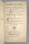 [ALLETZ (Pons Augustin)]: L'Albert Moderne ou Nouveaux Secrets éprouvés et licites recueillis d'après les découvertes les plus récentes. Les uns ayant pour objet de remédier à un grand nombre d'accidens qui intéressent la santé; les autres, quantité de choses utiles à savoir pour les différents besoins de la vie; D'autres, enfin tout ce qui concerne le pur agrément, tant aux champs qu'à la Ville. Paris, veuve Duchesne1768. Un volume. 9,5 par 16,5 cm. XXIV-432 pages. Plein veau d'époque, dos lisse orné. Coiffe supérieure arasée, craquelures sur le dos. Très rares rousseurs, sinon bon état intérieur. Un classique, dont le réputation n'est plus à faire… La première partie donne des recettes de santé, la deuxième concerne surtout l'alimentation et donne à lire de nombreuses recettes culinaires (confitures de carottes, recettes d'huîtres, moyen de faire cuire une volaille sans broche et sans feu, etc). La troisième et dernière partie traite des liqueurs et présente en outre de nombreuses recettes de droguerie''.