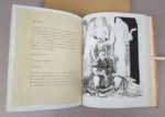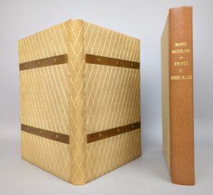 MAETERLINCK (Maurice): Ariane et Barbe bleue. Conte en trois actes de Maurice Maeterlinck. pointes sèches de Clark FAY. Lyon, Cercle lyonnais du livre, 1943. Un volume. 22,5 par 29 cm. feuillets non numérotés. Plein maroquin beige, plats ornés de croisillons de filets dorés et de deux listels de maroquin brun traversant, dos lisse orné, tranches dorées, bordure intérieure en croisillons, doublure et gardes de toile beige, couverture et dos conservés. Reliure signée CREUZEVAULT. Dans un emboitage en demi-maroquin lavallière. Parfait état de l'exemplaire. Léger brunissement de la couverture conservée, seul défaut de ce très bel exemplaire. Édition illustrée de 43 pointes sèches par Clark Fay. Un des 130 sur vélin bleu de Vidalon du tirage à 145 exemplaires (ici le N°46). Une illustration hiératique de ce conte angoissant, dans une reliure splendide.