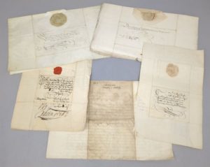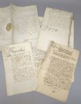 Un ensemble de 5 documents du 16ème et 17ème siècle, de provenance vraisemblablement alsacienne: Un document sur vélin, daté du 1er novembre 1660, avec son sceau. Un document daté du 29 mai 1661, avec son sceau. Un document daté de 1645, avec son sceau. Un document daté de 1559, avec ses deux sceaux Un document daté de 1649, avec son sceau. Pour les collectionneurs de sceaux anciens…
