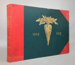 [HELOT (Jules)]: Histoire centennale du sucre de betterave [1812-1912]. Album illustré des reproductions de documents extraits de la collection de M. Jules Hélot. Édité en commémoration du centenaire de la fabrication du sucre indigène par le Syndicat des fabricants de sucre de France. Paris, Héliotypie Fortier et Marotte, 1912. Un volume. 29 par 40 cm. 179 pages. Demi-toile rouge à coins, dos lisse titré, plat supérieur orné d'une grande betterave dorée entourée des dates 1812 et 1912 (reliure de l'éditeur). Un coin usé, un angle avec une trace de mouillure (sans gravité), un numéro à l'encre dans un coin du plat supérieur, charnière intérieure fendue (sans incidence sur la solidité de l'exemplaire), sinon bon état de la reliure. Très bon état intérieur (quelques serpentes avec des plis). Nombreuses illustrations en noir et en couleurs dans le texte (caricatures, portraits, fac-similés, illustrations photographiques), sous serpentes, le tout monté sur onglets. Unique et impressionnante édition de ce rare album commémoratif du décret impérial du 24 janvier 1812 par lequel, à la suite de la première extraction industrielle de sucre de betterave par Jean-Baptiste Quéruel et Benjamin Delessert (fin 1811), fut organisée la première production industrielle sur le territoire de la France métropolitaine, alors complètement coupée de ses colonies sucrières comme du commerce britannique. Cette origine du sucre de betterave explique sans doute l'ex-libris de la bibliothèque de Marcel DUNAN, grand historien spécialiste du 1er Empire.