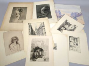 Une pochette de gravures comprenant: Trois épreuves d'artistes signées par Edouard CHIMOT, de gravures illustrant l'ENFER, de BARBUSSE. Ces trois EA sont à destination d'Huguette SIMON. Dont: Femme au spectre (28 par 39,5 cm Frontispice de l'Enfer, 25,5 par 32 cm. Un portrait de femme, 25,5 par 32 cm. Une gravure de Chimot, signée dans l'épreuve. Une gravure de la Grande rue de Saint-Malo, signée E. SOYER (?) Une aquarelle des bords de Seine, signée P. Monnfins (?) Quatre reproductions de gravures…