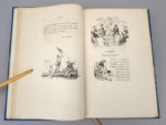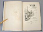 LEONNEC (Paul): Patara et Bredindin, aventures & mésaventures de deux Gabiers en bordée. Illustrées de 150 croquis à la plume. Paris, Vanier, 1884. Un volume. 15 par 23 cm. (4)-VIII-152 pages. Demi-percaline bleu à coins, pièce de titre noire, couvertures et dos conservées. Très bon état de l'exemplaire, si ce n'est quelques rousseurs uniquement sur les couvertures conservées. Exemplaire sur beau papier de Hollande numéroté 90, paraphé par l'éditeur, non rogné. Et enrichi d'une aquarelle originale en couleurs signée Paul Léonnec, sur la page de faux-titre. Le Breton Paul Léonnec (1842-1899) était officier de marine et caricaturiste au Journal Amusant.