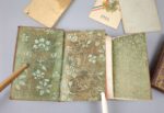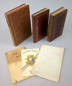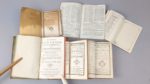 Réunion de 3 almanachs 18ème: Etrennes Bordeloises ou calendrier raisonné du Palais, pour l'année 1773. Bordeaux, Chapuis et Philippot. 6 par 11,5 cm. 240 pages. Plein maroquin rouge, plats encadrés d'une riche dentelle dorée, dos lisse orné, tranches dorées. Le titre est trompeur… Almanach historique du diocèse de Sens, pour l'année 1762. Sens, La Vigne et Duchesne. 6 par 12 cm. Plein maroquin rouge, dos 5 nerfs, plats avec un large encadrement doré, dos orné, tranches dorées. Exemplaire relié avec les deux feuilles de papier aux motifs floraux, qui devaient protéger les exemplaires brochés. Nouvel Almanach encyclopédique ou Chronologie des faits les plus remarquables (…). Année bissextile 1772. Amsterdam et Paris, Pillot, 1772. Plein veau fauve d'époque, dos lisse orné, pièce de titre rouge, triple filet doré encadrant les plats. On joint: Calendrier pour l'année 1816 à l'usage des habitans du département de l'Aveyron. Rodez, Carrere. Broché. Almanach de Liège pour l'année bissextile 1792. Liège, Le Marchand. Broché. Agenda publicitaire A la Bonne Fileuse, pour l'année 1918. Broché Trois charmants almanachs, bien accompagnés.