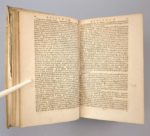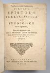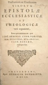 [Protestantisme] HARTSOEKER (Christian) et LIMBORCH (Philippe de): Praestantium ac eruditorum virorum epistolae ecclesiasticae et theologicae varii argumenti, inter quas eminent eae, quae a Iac. Arminio, Conr. Vorstio, Sim. Episcopio, Hug. Grotio, Casp. Barlaeo, conscriptae sunt. Amsterdami, Apud Henricum Dendrinum, 1660. Un volume. 12,5 par 20 cm. (16)-961-(21) pages. Plein vélin à recouvrement d'époque titré de façon manuscrite, en très bon état (bord du 1er plat légèrement décollé). Quelques piqûres éparses, papier parfois légèrement roussi, manque de papier à la page de garde, sinon très bon état. Edition originale rare, qui connut plusieurs rééditions en un siècle malgré l'interdiction des thèses des Remontrants. Cette célèbre collection de lettres est une défense des thèses du parti Remontrant par ses plus illustres représentants, et en particulier ARMINIUS et GROTIUS. Les éditeurs Limborch et Hartsoeker voulaient montrer au moyen de ces lettres l'orthodoxie du mouvement des Remontrants." J. Arminius (1560 - 1609), ministre de l'église réformée des Pays-Bas, s'opposa à la sévérité de la doctrine calviniste de la prédestination et lui préféra l'idée d'une élection conditionnelle. Le plus célèbre des Remontrants fut sans doute Hugo Grotius (1583-1645), immense intellectuel, qui définit le premier ce que devait être un droit international, et contribue au droit de la paix et la guerre, et à la définiton du droit naturel. . Cet ouvrage comporte 25 lettres de Grotius.