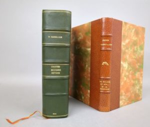 BARBELLION (Pierre, docteur) : Ma mouche et moi… et les poissons. Paris, Maloine, 1971. Un volume. 18,5 par 26 cm. 239 pages. 26 hors-textes dont 2 en couleurs (complet). Demi-maroquin fauve. Exemplaire à l'état de neuf. Un des 200 exemplaires sur pur fil lafuma, numéroté (155), définissant l'édition originale. Toujours aussi pédagogique, le Docteur Barbellion expose ses techniques de pêche à partir de son immense expérience, avec 26 hors-textes pour les illustrer, et de nombreux dessins dans le texte. Un exemplaire pour collectionneur... Avec BARBELLION (Dr Pierre): Truites, mouches, devons. Mouches sèches - Mouche noyée - Lancer léger et extra léger, ultra-léger. Paris, Maloine, 1948. Un volume. 17,5 par 26 cm. XII-1183 pages, et 51 planches hors-texte (certaines sur papier fort), dont deux de reproductions de mouches en couleurs (complet). Demi-chagrin vert d'époque, 4 nerfs, couverture illustrée conservée (petite déchirure sur la couverture conservée, sans manque, restaurée). Parfait état de l'ouvrage. 567 illustrations dans le texte. C'est une des Bibles de la pêche, complète sur l'ensemble des techniques, du matériel, comme de l'histoire de ce sport halieutique.