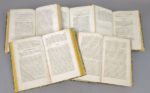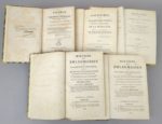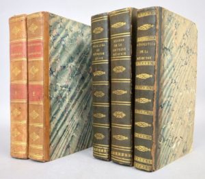 Réunion de 4 ouvrages 19ème de médecine, en 5 volumes reliés: 1. BROUSSAIS (François-Joseph-Victor): Examen de la doctrine médicale généralement adoptée, et des systèmes modernes de nosologie, dans lequel on détermine, par les faits et par le raisonnement, leur influence sur le traitement et sur la terminaison des maladies ; suivi d'un plan d'études fondé sur l'anatomie et la physiologie, pour parvenir à la connaissance du siège et des symptômes des affections pathologiques, et à la thérapeutique la plus rationnelle. Paris, Gabon, 1816. Un volume. 12 par 20,3 cm. (4)-XIX-(1)-475 pages. Demi-basane brune de l'époque, dos lisse orné. Bon état de la reliure, rousseurs claires éparses. Edition originale. 2. METZGER (Johann Daniel): Principes de médecine légale ou judiciaire, traduits de l'allemand du docteur J. Dan. Metzger, et augmentés de notes, par le Dr J.J. Ballard. Paris, Gabon, 1813. Un volume. 12 par 20,5 cm. (2)-XXIII-(1)-504 pages. Demi-basane brune de l'époque, dos lisse orné. Bon état de la reliure, très rares rousseurs claires éparses. 2e édition en français. 3. BROUSSAIS (François-Joseph-Victor): Histoire des phlegmasies ou inflammations chroniques, fondée sur de nouvelles observations de clinique et d'anatomie pathologique : ouvrage présentant un tableau raisonné des variétés et des combinaisons diverses de ces maladies, avec leurs différentes méthodes de traitement. Deuxième édition. Paris, Gabon et Crochard, 1816. 2 volumes. 12,3 par 20 cm. (4)-XX-648; (4)-584 pages. Demi-basane fauve de l'époque, dos lisses ornés, pièces de titre et de tomaison rouges. Bon état de la reliure. Papier ayant tendance à brunir, sans gravité. 2e édition (E.O. : 1808). 4. CABANIS (Pierre-Jean-Georges): Coup d'oeil sur les révolutions et sur la réforme de la médecine. Paris, Crapart, Caille et Ravier, An XII-1804. Un volume. 12 par 20 cm. XII-438 pages. Demi-basane brune de l'époque, dos lisse orné. Bon état de la reliure (mors frottés sans atteinte à la solidité de l'ouvrage), rousseurs claires éparses, petites mouillures marginales sur une vingtaine de ff. Deux derniers feuillets restaurés sans manque. Edition originale. Wellcome II-283 ; Waller 12858. «Les révolutions médicales n'ont été que des révolutions d'idées et n'ont fait qu'engendrer le scepticisme du public et l'arrogance des charlatans. La nouvelle doctrine médicale sera constituée par les relations d'ordre et d'enchaînement logique, établies entre des tableaux méthodiquement rassemblés d'observations et d'expériences». Livre important.