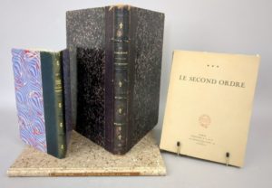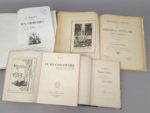 Lot de 4 ouvrages sur la noblesse: 1. JOURDA DE VAUX (Gaston de): La noblesse de la Haute-Loire aux armées (1914-1919). Texte et planches d'armoiries. Le Puy, Badiou-Amant et Mallon-Veysseyre, s.d. [1920]. Un volume. 21 par 27,5 cm. 1 frontispice compris dans la pagination-120 pages + 6 planches h.t. Cartonnage bradel moderne. Bon état de l'exemplaire. Edition originale. Tiré à 140 exemplaires (N°57). Très rare. Saffroy 26548. 2. HANE-STEENHUYSE (Ernest, Comte d'): Etudes historiques sur les coutumes féodales. Gand, Imprimerie et Lithographie de L. Hebbelynck, 1863. Un volume. 12,5 par 19,5 cm. 109 pages. Demi-basane noire de l'époque, dos à nerfs orné. Très bon état de l'exemplaire. Edition originale. Saffroy I-6841 : "Etude sur la noblesse chevaleresque et communale." 3. [JOUGLA DE MORENAS (Henri)]: Le second ordre. Paris, Société du Grand Armorial de France, 1947. Un volume. 16 par 21,5 cm. 1 frontispice compris dans la pagination-495-(1) pages. Broché, sous couverture imprimé. Bon état. Edition originale. Tirée à 625 exemplaires (N°465). Saffroy 6761. "Cet écrit eut un succès considérable parce qu'il mentionne un grand nombre de familles classées par ordre d'ancienneté. Il est devenu rare et recherché." (Saffroy). 4. ROGER (Paul-André): La noblesse de France aux croisades. Paris, Derache, Dumoulin ; Bruxelles, Vandale, 1845. Un volume. 18,5 par 28 cm. 1 frontispice-399 pages, + 12 planches h.t. Demi-chagrin brun de l'époque, dos à nerfs orné de fleurs de lys. Légers frottements sur le dos, rousseurs éparses, cachets d'ancienne appartenance sur les ff. de faux-titre et de titre. Edition originale. Saffroy I-3601.