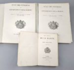 Lot de 3 rares états militaire de la marine: 1. État des pensions du département de la Marine, accordées depuis le 1er janvier 1827 jusqu'au 31 décembre de la même année. Paris, Imprimerie Royale, mai 1828. Un volume. 22,5 par 28,5 cm. VIII-125 pages. Broché, couverture muette de l'époque, pièce de titre imp. collée sur le plat sup.. Très bel exemplaire dans sa condition d'origine. Edition originale, peu fréquente. Manque à Polak. Liste nominale de 2865 bénéficiaires de pensions accordées par le département de la Marine durant l'année 1827, avec indication de la date, du lieu de naissance, du domicile, du grade, de la durée de service (sauf pour les demi-soldes), et du montant de la pension. 2. État des pensions du département de la Marine, accordées depuis le 1er janvier 1828 jusqu'au 31 décembre de la même année. Paris, Imprimerie Royale, mai 1829. Un volume. 22,5 par 28,5 cm. X-159 pages. Broché, couverture muette de l'époque, pièce de titre imp. collée sur le plat sup. Petit défaut au dos. Edition originale, peu fréquente. Manque à Polak. Liste nominale de 3648 bénéficiaires de pensions accordées par le département de la Marine durant l'année 1828, avec indication de la date, du lieu de naissance, du domicile, du grade, de la durée de service (sauf pour les demi-soldes), et du montant de la pension. 3. État général de la Marine et des Colonies. 1er août 1848. Paris, Imprimerie Nationale, 1848. Un volume. 12,5 par 20,5 cm. VII-(1)-256 pages. Broché, sous couverture imprimée. Très petite galerie de vers dans la marge inf. des 10 premiers ff. sans atteinte du texte, sinon très bon état. Pp. 207 à 252 : Table alphabétique des noms contenus dans l'État. Des sources documentaires importantes…