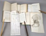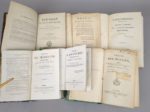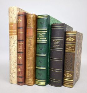 Réunion de 6 ouvrages 19ème sur la chirurgie, reliés: 1. LAWRENCE (William): Traité des hernies, contenant la description anatomique et l'exposition des symptômes de la marche et du traitement de ces maladies. Traduit de l'anglais, sur la troisième édition, par P.A. Béclard et J.G. Cloquet. Paris, Méquignon-Marvis, 1818. Un volume. 12,5 par 20 cm. XII-585 pages + 2 planches h.t. (dont 1 dépl.). Demi-maroquin vert moderne à grain long, dos 4 nerfs à décors à froid et chainettes, genre Romantique. Excellent état de la reliure. Quelques rousseurs éparses, cachet de la bibliothèque du professeur J. Cloquet sur le f. de titre. Envoi autographe d'un des traducteurs sur la page de titre. Edition originale en français (E.O. en anglais : 1807). Wellcome III-p. 462. 2. -1 MAYOR (Mathias): Excentricités chirurgicales, ou nouveaux mémoires pour servir à la réforme et au perfectionnement de la médecine opératoire. Lausanne, Marc Ducloux ; Paris, Labé, 1844, 420-(1) pages ; (suivi de). -2) MAYOR (Charles): De la localisation des bains et de l'application du froid et de la chaleur sur les diverses parties du corps humain. Lausanne, Georges Bridel ; Paris, Allouard, 1844, 19 pages. Soit 2 ouvrages en 1 volume 13,5 par 22 cm. Cartonnage bradel moderne. Quelques rousseurs claires éparses. Editions originales. 3. BOUILLET (Dr Jean): Bouisson, sa vie et son oeuvre. Étude couronnée par la Faculté de Médecine de Montpellier (Premier prix Bouisson 1890). Montpellier, Camille Coulet ; Paris, G. Masson, 1890. Un volume. 13 par 20,5 cm. 237-(3) pages. Demi-basane sanguine de l'époque, dos orné. Petite épidermure sur le plat inf., très bon état intérieur. Etienne Frédéric Bouisson, professeur à la Faculté de médecine de Strasbourg puis à Montpellier, titulaire de la chaire de pathologie interne (1839), de clinique interne (1845), de médecine opératoire (1869). Consacre ses travaux à l'anatomie, aux humeurs et aux sécrétions. Publie plusieurs ouvrages dont le Traité théorique et pratique de la méthode anesthésique.'' 4. CARTIER (Louis-Vincent): 1) Précis d'observations de chirurgie faites à l'Hôtel-Dieu de Lyon. Lyon, Reymann et Comp.e ; Paris, Veuve Perisse, 1802 - An 11, XII-243-(1) pp. ; (suivi de). -2) De la médecine interne appliquée aux maladies chirurgicales. Lyon, J.M. Barret, 1807, 80 pp. ; soit 2 ouvrages en 1 volume. 12 par 20 cm. Pleine basane racinée de l'époque, dos orné, frise dorée encadrant les plats. Coins légèrement usés, quelques feuillets légèrement roussis. Edition originale. 5. VELPEAU (Alfred Armand Louis Marie): Manuel d'anatomie chirurgicale, générale et topographique. Paris, Méquignon-Marvis Père et Fils, 1837. Un volume. 9,5 par 15,5 cm. XI-(1)-609 pp. + 3 tableaux dépliants h.t. Demi-veau chocolat de l'époque, dos orné, reliure Romantique. Très belle reliure, très rares rousseurs. Edition originale. 6. MALGAIGNE (Joseph-François): Manuel de médecine opératoire, fondée sur l'anatomie normale et l'anatomie pathologique. Cinquième édition, corrigée et augmentée. Paris, Germer Baillière, 1849. Un volume. 10,5 par 17,5 cm. XII-707-(1) pages. Demi-chagrin brun d'époque, dos lisse. Reliure en parfait état, quelques rousseurs claires éparses. 5e édition corrigée et augmentée (E.O. : 1834). M. Dupont, Dictionnaire historique des médecins, p. 411 ; Garrison and Morton, n° 5591 (éd. de 1834). Malcaigne, fondateur du Journal de chirurgie, fut un très bon opérateur, inventant des appareils pour traiter les fractures.