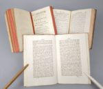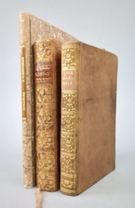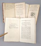 Lot de 4 ouvrages 18ème sur Jean-Jacques Rousseau en 3 volumes: 1. ROUSSEL (Claude): La loi naturelle. Paris, Humblot, 1769. Un volume. 9 par 15,5 cm. [III] à XXIV-288 pages (mal ch. 228). Pleine basane de l'époque, dos lisse orné, roulette sur coupes. Plats lég. tachés. -Mouillure très claire dans l'ensemble des marges, cachet d'une ancienne appartenance. Le faux-titre manque. Edition originale. Conlon 69 : 1193. Claude Roussel enseigna la philosophie à Chalons (en Champagne). Son ouvrage est une réponse aux thèses de J.-J. Rousseau sur le droit naturel. Avec 2. 1) SERVAN (Joseph-Michel-Antoine): Réflexions sur les Confessions de J. J. Rousseau, sur le caractère & le génie de cet écrivain, sur les causes & l'étendue de son influence sur l'opinion publique, enfin sur quelques principes de ses opinions. Paris [i.e. Lausanne, H.E. Vincent], 1783, 225 pp. ; suivi de 2) CHAS (François): J. J. Rousseau justifié, ou réponse à M. Servan. Neuchatel, Favre et Comp., 1784, 259 pp. + IV pp. (Avis de l'éditeur, relié entre les pp. 250-251). 9,5 par 16 cm. Pleine basane de l'époque, dos lisse orné, pièce de titre rouge. Petit défaut à un coin, sinon très bel état de la reliure. Très bon état intérieur. 1) Edition parue la même année que l'originale. Conlon, Ouvrages français relatifs à J.-J. Rousseau, 675. "Adresse fictive : édition imprimée à Lausanne par Henri-Emmanuel Vincent, identifiable à son matériel typographique." (RERO). Ouvrage très critique contre Rousseau et ses Confessions, dont «les conséquences sur les moeurs seront funestes» ... 2) Edition originale. Conlon 84 : 910 ; V. M. Marchand, Rousseau, les 7 vies d'un visionnaire. "Dans son Rousseau justifié, François Chas dénonce "la rage de ses persécuteurs" et s'étonne que "celui qui s'occupait du bonheur des hommes" fût déclaré "l'ennemi du genre humain"." (V.M. Marchand). Avec 3. CORANCEZ (Olivier de): De J.J. Rousseau. Extrait du journal de Paris (…) de l'an VI. S.l., Imprimerie du Journal de Paris, s.d. (circa 1798). Un volume. 12 par 19 cm. 75 pages. Cartonnage bradel moderne et parfait état. Petite brunissure sur le dernier feuillet, sinon très bel état du texte. Edition originale. Conlon 1049. Grand amateur de musique, c'est Corancez qui présenta GLUCK à Rousseau. Il fut aussi un des propagateurs de la rumeur du suicide de Rousseau…