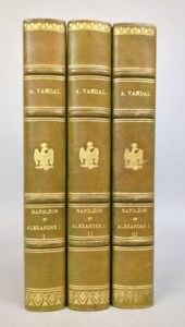 VANDAL (Albert): Napoléon et Alexandre 1er. L'alliance russe sous le Premier Empire. Paris, Plon, 1896-1897. 3 volumes. 15 par 24 cm. Plein chagrin vert, dos 4 nerfs, orné de l'Aigle impériale, tête dorée, couvertures conservées. Reliure signée BONNEAU. Dos insolé, deux coins légèrement émoussés. Très bon état intérieur (sauf pour les couvertures conservées, légèrement salies). 4ème édition de cette étude approfondie. Ex-libris de Marcel DUNAN, grand historien de l'Empire.