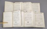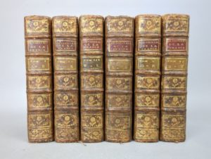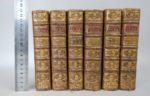 HESSELN (Robert de): Dictionnaire universel de la France contenant la description géographique & historique des provinces, villes, bourgs & lieux remarquables du royaume ; l'état de la population actuelle, de son clergé, de ses troupes, de sa marine, de ses finances, de ses tribunaux, & des autres parties du gouvernement : ensemble l'abrégé de l'histoire de France, divisée sous les trois races de nos rois ; des détails circonstanciés sur les productions du sol, l'industrie & le commerce des habitans ; sur les dignités & les grandes charges de l'Etat ; sur les offices de la judicature & emplois militaires ; ainsi que sur ceux de toutes les autres branches de l'administration. Avec un grand nombre de tables qui rassemblent, sous un même coup d'oeil, les divers districts ou arrondissemens du gouvernement ecclésiastique, civil & militaire. Paris, Desaint, 1771. 6 volumes. 10,5 par 16,5 cm. XVI-664; (4)-680; 675; (4)-714; (4)-659; (4)-645-(2) pages. Plein veau de l'époque, dos 5 nerfs ornés, pièce de titre rouge. Petits défauts mineurs (une coiffe usée, quelques coins légèrement émoussés, trois petits trous de ver sur les reliures). Quelques rousseurs, traces discrètes d'humidité, intérieur convenable. Edition originale. Conlon 71 : 1021 ; INED 2270. Robert de Hesseln, ingénieur géographe et censeur royal, fut à l'origine d'un projet de cadastre qui ne vit jamais le jour. Il donne ici un remarquable aperçu excessivement détaillé, outre la partie géographique, de tout ce qui peut être considéré comme administratif. Importante source documentaire.