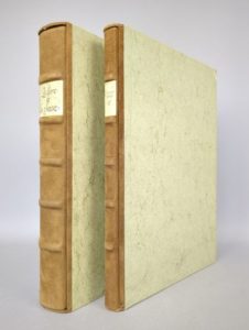 PHOEBUS (Gaston III comte de Foix dit): Le Livre de la Chasse - Manuscrit Français 616 de la Bibliothèque Nationale. Introduction et commentaires Marcel THOMAS, François AVRIL, Duc de BRISSAC. Traduction en Français moderne Robert et André BOSSUAT. Paris, Club du Livre, Philippe Lebaud, 1976. 2 volumes. 27 par 35 cm. XXI-58 pages pour le volume de commentaire et de traduction. 138 feuillets de fac-similé en couleurs pour le volume reproduisant l'original. Plein daim fauve pour le fac-similé, demi-daim fauve pour les commentaires, dos 5 nerfs, chacun dans leur étui bordé. Parfait état. Magnifique travail de reproduction de cet ouvrage célèbre le procédé du Dr Struzl. Exemplaire numéroté 2067 sur 3000.