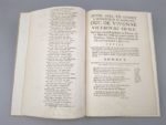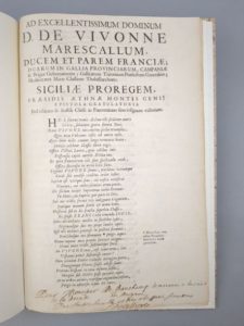 CELLIÈRES (Laurent de): Ad Excellentissimum dominum D. De Vivonne marescallum […] . Epistola gratulatoria post relatam de hostili Classe in Panormitano sinu insignem victoriam. (Suivi de). Devise avec un sonnet à Monseigneur le maréchal de Vivonne vice-roy de Sicile, après la glorieuse expédition de Palerme, où ce maréchal brûla un grand nombre de vaisseaux, galères, & autres bastimens de l'armée ennemie le 2 juin 1676. S.l.n.d. [1676]. Un fascicule. 23,5 par 35,5 cm. 3 pages. Cartonnage moderne à la Bradel, pièce de titre brune. Parfait état de la reliure, très bon état intérieur (traces d'anciennes pliures). Long envoi autographe de l'auteur: "Pour Monsieur De Bauchamp demeurant à la rüe de la Dorade en Avignon, par son très humble et très obéissant serviteur, De Cellières". Edition originale très rare. Le CCFr. n'en localise qu'un seul exemplaire (B.M. de Lyon) ; le Worldcat n'en recense aucun autre ; inconnu à De Backer et Sommervogel. Le Père jésuite Laurent de Cellières, né en 1630 à Saint-Didier-la-Seauve (Haute-Loire) entra au noviciat en 1645. Il professa pendant 22 ans la grammaire, les humanités, la rhétorique, la philosophie et les mathématiques. Il mourut […] entre 1721 et 1726. Ces deux textes glorifient le Maréchal de Vivonne, qui venait, le 2 juin 1676, de détruire en partie la flotte hispano-hollandaise qui mouillait au large de Palerme.