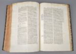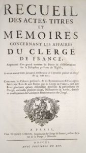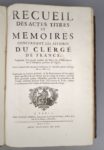 FOUQUET (Bernardin-François) et DU VIVIER DE LANSAC (Abbé Pierre-Hippolyte): Recueil des actes, titres et mémoires concernant les affaires du clergé de France, augmenté d'un grand nombre de pièces et d'observations sur la discipline présente de l'Église, et mis en nouvel ordre suivant la délibération de l'Assemblée générale du clergé du 29 août 1705. Contenant les cahiers présentés, et les remontrances et harangues faites aux rois et aux reines par le clergé de France, tant aux états généraux qu'aux assemblées générales et particulières du clergé ; ensemble plusieurs édits, déclarations et arrêts, donnés en conséquence des cahiers et remontrances du clergé. Paris, Pierre Simon, 1740. Un volume. 25 par 38,5 cm. (2)-XVI-(2) pages et 1780 colonnes. Plein veau de l'époque, dos 6 nerfs orné, coiffes abimées, 1 mors fendu sur 10 cm, 2 coins émoussés. Très minces mouillures claires dans la partie sup. de 3/4 des feuilles, quelques rares rousseurs claires. Malgré ces défauts, un bon exemplaire. Edition originale. Lelong 6947. Volume complémentaire de la collection, composé par Lemerre Père et Fils: Recueil des actes, titres et mémoires concernant les affaires du clergé de France, comportant 12 volumes. Ce volume est d'ailleurs considéré par quelques bibliographes comme le 13e volume de cette collection. Il est consacré aux remontrances et harangues du clergé de 1579 à 1738.