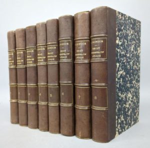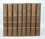 DUFOUR (Gabriel): Traité général de droit administratif appliqué ou exposé de la doctrine et de la jurisprudence concernant l'exercice de l'autorité du chef de l'État, des ministres, des préfets, des sous-préfets, des maires, des conseils de préfecture, de la Cour des Comptes, du Conseil d'État, l'Algérie, les colonies, les ateliers insalubres, les bacs et bateaux, les bois et forêts, les chemins de fer, les chemins vicinaux, les communes, les conflits, les contributions, les cours d'eau, etc., etc.. Troisième édition revue et considérablement augmentée. Paris, Delamotte, 1868-1870. 8 volumes. 13 par 21,5 cm. Demi-chagrin brun de l'époque, dos 4 nerfs. Très bon état de la reliure, très rares rousseurs. Le cahier 11 du tome 6 est relié par erreur entre les cahiers 20 et 21 (texte complet). 3e édition (E.O. : 1843-45). «L'ouvrage constitue la première présentation ordonnée de grande ampleur, synthèse de l'analyse doctrinale et de la pratique car l'auteur était avocat au Conseil d'État. Il est le premier de ces traités monumentaux administratifs qui seront produits dans la deuxième moitié du siècle (Ducrocq, Batbie…). Mais on doit également louer en lui une exceptionnelle qualité d'exposition, un souci constant de l'analyse des textes. La partie consacrée à la technique du contentieux administratif nous paraît supérieure à tout ce qui a été écrit sur la question jusqu'à Laferrière».