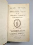 Constitution Française, présentée au Roi par l'Assemblée nationale le 3 septembre 1791. Vienne, Chize et Pélisson, 1791. Un volume. 7 par 11,5 cm. 168 pages. Pleine basane d'époque, dos lisse avec un décor de bonnets phrygiens. Plats encadrés de chainettes dorées. Bon état de la reliure, très rares rousseurs dans le texte (sans gravité), petite tache sur la tranche. «La Constituante amende et adopte le 3 septembre 1791 la nouvelle Constitution, connue sous le nom de Constitution de 1791. Louis XVI l'accepte le 14 septembre1, lui jure fidélité et fait passer la France d'une monarchie absolue à une monarchie constitutionnelle. Cette Constitution abolit la notion de droit divin qui donnait au roi un pouvoir absolu sur la France. Le roi doit dorénavant prêter serment devant la nation, jurant de maintenir en place la Constitution et de l'appliquer ; il porte maintenant le titre de roi des Français» Wikipédia. Cette édition comprend le discours du Roi, et la réponse du président de l'Assemblée, ainsi qu'une table. Le décor du dos fait l'originalité de cet exemplaire…