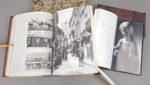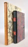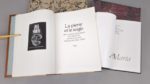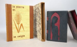 Deux très belles reliures contemporaines Ave Maria. Des poètes et les sculptures d'Yves le Pape chantent la Vierge. S.l., CLD Normand, 1976. Un volume. Plein chagrin noir et rouge, reproduisant la silhouette de la Vierge en relief, dos 4 nerfs, couvertures conservées, étui bordé. Excellent état de cette belle reliure Avec DUFOUR (Bernard): La Pierre et le seigle. Histoire des habitants de Villefranche-sur-Rouergue racontée par les photographies d'amateurs et les albums de famille. 1860-1950. Paris, seuil, 1977. Un volume. Demi-chagrin fauve à bandes, dos lisse. Plat supérieur recouvert d'un papier végétal, avec le titre et un épi de blé en mosaïque de chagrin fauve. Couvertures conservées, dans un étui bordé. Parfait état. Deux très belles reliures, qui auraient mérité d'être signées. Les deux ouvrages