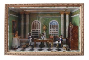 Intérieur animé du bureau de Fontainebleau, avec personnages, cartes étalées sur un bureau et bibliothèque (365 x 240 x 240 mm).