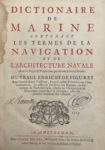 Amsterdam, Brunel, 1702 ; in-4 veau brun de l’époque, dos à nerfs orné, pièce rouge, tranches marbrées. Édition originale. Le meilleur dictionnaire de Marine avant celui de Savérien. Il contient les définitions, qui forment parfois des chapitres entiers, en français mais aussi la traduction des mots en néerlandais.