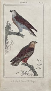 Sans lieu ni date, vers 1825 ; 2 vol. in-8, demi-maroquin aubergine, dos lisses à nerfs ornés en long. Deux volumes de planches isolés, l’un pour les oiseaux, l’autre – avec portrait de Buffon – pour les mammifères. Soit environ 190 planches aquarellées d’animaux, plus 4 cartes et 9 planches en noir.