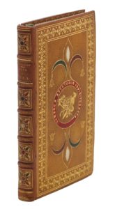 Lausanne et Genève, 1751 ; in-12, reliure de la fin du XIXe siècle maroquin citron, les plats ornés d’une large roulette dorée, motif mosaïqué au centre symbolisant le bonnet à grelots des fous, dos à nerfs orné de motifs mosaïqués dans les mêmes tons, tranches dorées (Sarazin).Édition agrémentée de 12 gravures par Poissy : costumes, bannières, sceaux… L’auteur étudie l’histoire de la fête des fous, issue des saturnales antiques, et s’intéresse particulièrement à la société de la Mère Folle de Dijon. – Bel exemplaire en reliure mosaïquée.