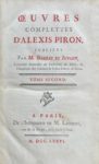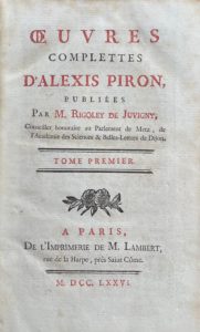 Paris, Lambert, 1776 ; 7 vol. in-8, demi-basane blonde, dos à nerfs ornés de fleurons à froid, pièces rouges et vertes. Édition collective publiée par Rigoley de Juvigny, membre, tout comme Piron, de l’Académie des Sciences de Dijon et ami de l’auteur.