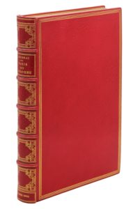 Paris, imprimé pour Henri Beraldi, 1893 ; petit in-4, maroquin vermillon, trois filets dorés sur les plats, dos à nerfs ornés de filets dorés s’entrecroisant, larges roulettes intérieures, tranches dorées, couverture et dos. Édition originale du texte par un digne représentant de la bohème littéraire. Il fait le tour des bars, des cafés, des restaurants et cabarets, des plus miteux aux plus élégants en passant par les plus joyeux.