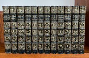 Paris, Quantin, 1878-1883 ; 12 vol. in-8, demi-maroquin bleu marine à coins, filet doré, dos à nerfs très ornés avec motifs de carquois, d’oiseaux, de papillons, têtes dorées, couvertures ornementées (Vermorel).Collection complète, réunissant les œuvres de Voisenon, Boufflers, Caylus, Crébillon fils, Moncrif, de La Morlière, Duclos, Cazotte, Restif de la Bretonne, Besenval, Fromaget et Godard d’Aucour. Chaque volume renferme une notice bio-bibliographique par Octave Uzanne. L’illustration comprend, pour chaque volume, un portrait de l’auteur, un fleuron hors texte et plusieurs vignettes gravées d’après les artistes du XVIIIe siècle. Tirage à petit nombre, celui-ci sur beau vergé.