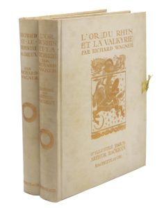 Paris, Hachette & Cie, s.d. [1910-1911] ; 2 vol. in-4, bradel vélin ivoire de l'éditeur, plats ornés et dorés, étui. L’Or du Rhin et la Valkyrie. 34 compositions hors texte en couleurs sous serpentes imprimées et de nombreux dessins en noir dans le texte par Arthur Rackham. Tirage à 330 exemplaires, celui-ci un des 300 exemplaires sur vélin à la forme.