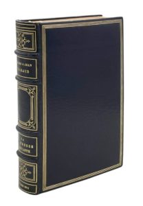 Paris, Émile Paul, 1911 ; in-12 maroquin à gros grain bleu nuit, 3 filets dorés en encadrement, dos à nerfs orné de motifs dorés, doublures de maroquin rouge avec cadre de 6 filets dorés, gardes de soie bleu nuit, tranches dorées sur témoins, couverture et dos (René Aussourd).Édition originale de ce roman qui fit la réputation des frères Tharaud.