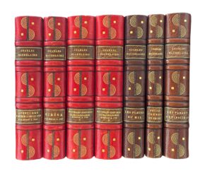Paris, Helleu et Sergent, 1917-1924 ; 7 vol. in-8 carré, demi-maroquin à gros grain à coins, vermillon pour 4 volumes, brun pour 3 volumes, filet doré, dos à nerfs ornés en long de demi-cercles de filets dorés, listel vertical central de maroquin ébène, pièces havane, têtes dorées, couvertures (Mazère).Réunion des 3 recueils poétiques de Baudelaire (reliés en brun) et de ses 4 traductions d’Edgar Poe (reliées en rouge). Chaque volume est orné de gravures par différents artistes. – Préfaces d’André Gide et de Paul Valéry. – Deux portraits de Baudelaire.