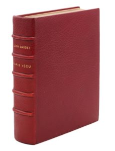 Paris, éditions du Capitole, 1930 ; 2 tomes en un vol. in-4, maroquin janséniste bordeaux, dos à nerfs, doublures de maroquin mosaïqué, gardes de moire rouge, têtes dorées, couvertures et dos, étui moderne (M.-L. Therré).Souvenirs sur Paris ornés de 84 dessins et d’une eau-forte originale de P.-J. Poitevin.