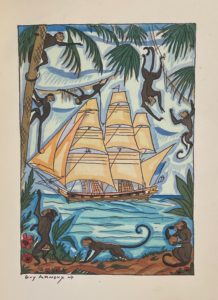 Paris, éditions pittoresques, 1929 ; petit in-4, demi-maroquin vert à coins, dos à nerfs orné d’une composition mosaïquée dans le caisson central, tête dorée, couverture illustrée en couleurs (Blanchetière).Roman maritime orné de nombreuses gravures sur bois de Guy Arnoux, aquarellées au pochoir.