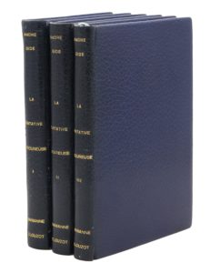 1950] ; 3 parties en 3 vol. petit in-8, maroquin janséniste bleu marine, dos lisses, quelques gros pointillés dorés sur les coupes, contreplats avec cadre de maroquin havane sur fond de maroquin bleu, rectangle de moire bleu ciel au centre, gardes de moire bleu ciel, têtes dorées, couverture, étuis. Ravissant ouvrage orné à chaque page d’eaux-fortes originales de Marianne Clouzot, laissant parfois peu de place à la typographie.