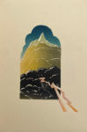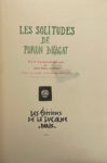 Paris, les Éditions de la Lucarne, 1927 ; petit in-4 en ff. sous chemise en papier reliure, le tout contenu entre deux plaques de bois clair aquarellées de bleu, le plat supérieur constellé de perles collées (quelques-unes manquent), lacets. Album d’estampes inspirées d’un chapitre du Livre de la jungle de Rudyard Kipling, précédé de deux feuillets de légendes. L’artiste est inconnu de nous, mais ce livre montre combien la beauté, quand on la rencontre, se reconnaît au premier coup d’œil. Les 24 estampes au pochoir en couleurs dégradées sont d’une rare délicatesse. Elles ont été tirées sur les presses de l’artiste, « à la vue de Montmartre, à l’heure où le crépuscule joue avec la Butte sur les nuées changeantes des ciels parisiens (…). Adieu, rude labeur qui m’a procuré l’illusion d’un beau voyage… » (achevé d’imprimer).