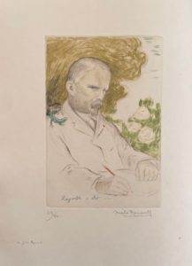 Exemplaire bien relié, enrichi d’un portrait à l’eau-forte en couleurs de Jules Renard par Malo Renault, signé et justifié 23 / 50 ; d’une suite sur Chine tirée à 12 exemplaires, de 3 menus illustrés dont un en double état et de l’invitation pour le livre. – Dos un peu foncé. – Ex-libris André Barrier.